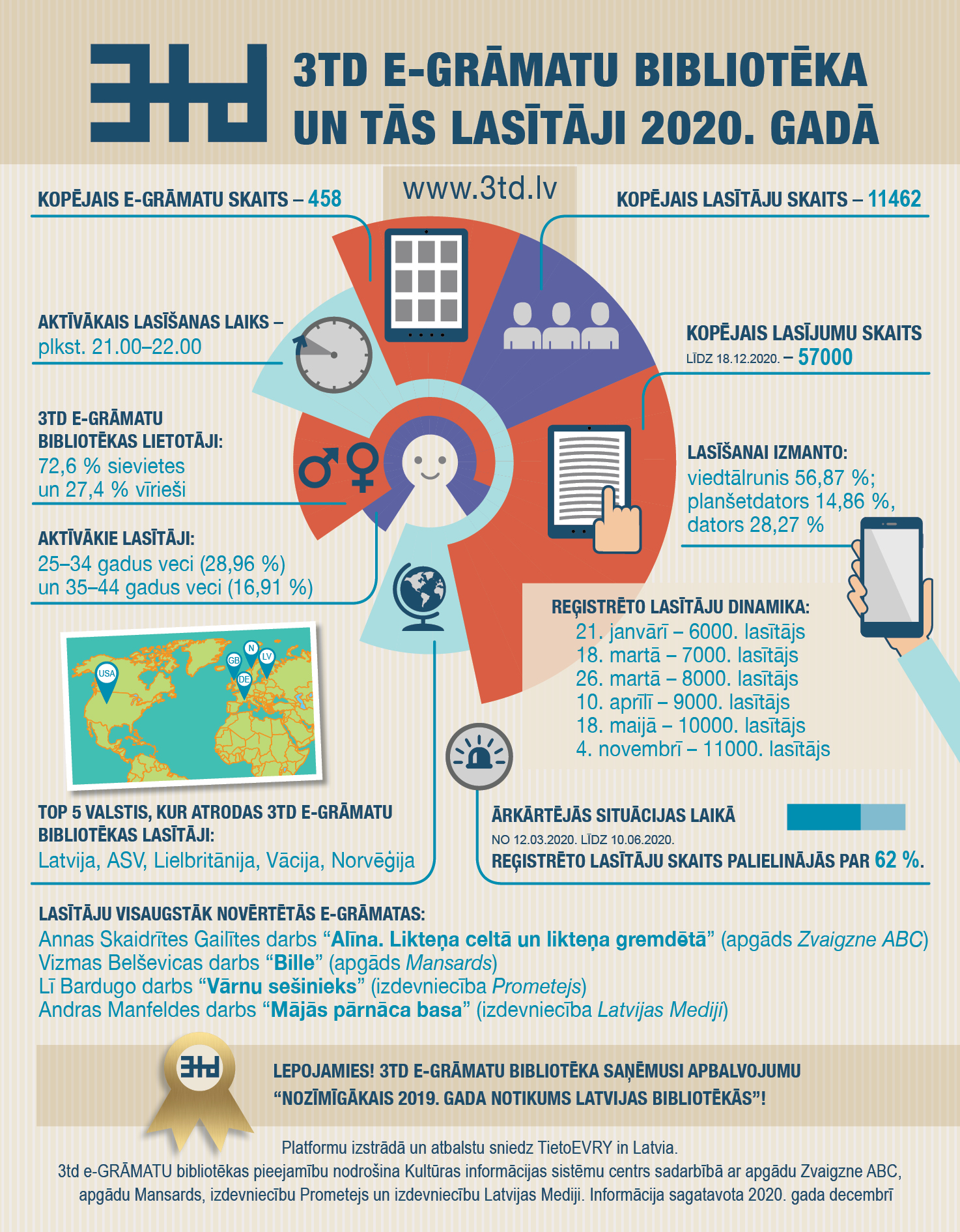 Jaunā – 2021. – gada pirmajās dienās savas pastāvēšanas otro gadadienu atzīmē lasītāju iecienītā 3td e-GRĀMATU bibliotēka (vietnē www.3td.lv), kas salīdzinoši īsā laikā ieguvusi lielu popularitāti un iekarojusi noteiktu vietu grāmatniecības un bibliotekāro pakalpojumu klāstā, lasītāju skaita ziņā kļūstot par vienu no lielākajām publiskajām bibliotēkām Latvijā. Kultūras informācijas sistēmu centra (KISC) pārziņā esošajā e-grāmatu lasīšanas platformā šobrīd ar valsts atbalstu tiek piedāvāts bez maksas lasīt gandrīz pustūkstoti e-grāmatu latviešu valodā, ko sarūpējušas četras izdevniecības – “Zvaigzne ABC”, “Apgāds Mansards”, “Prometejs” un “Latvijas Mediji”.