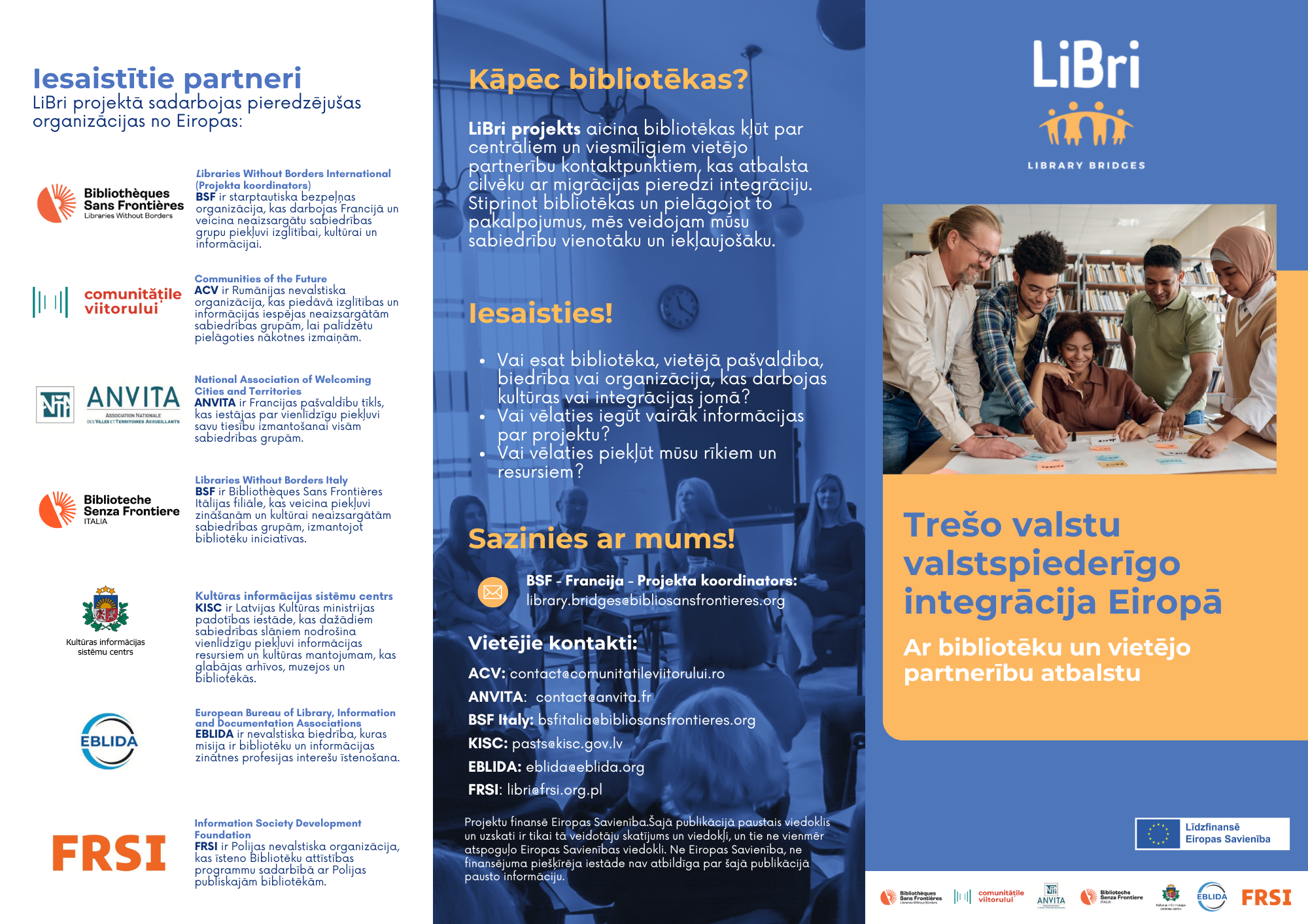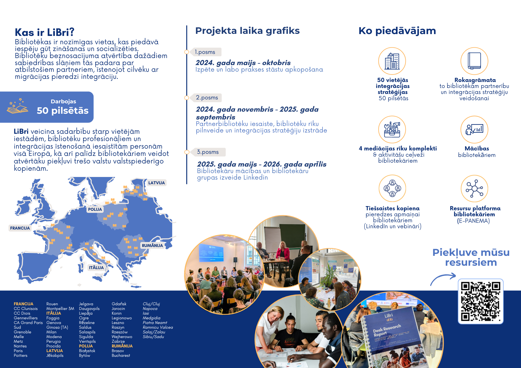 - 2025.gada 4. aprīlis - Kultūras informācijas sistēmu centra organizētais LiBri projekta vidustermiņa seminārs Rīgā.Pasākumā piedalās pārstāvji no projekta partnerorganizācijām Francijā, Itālijā, Polijā, Rumānijā un Nīderlandē. Semināra diena norit ļoti produktīvi un piesātināti, dalībniekiem daloties pieredzē un pārrunājot partneru dažādos izaicinājumus un veiksmes stāstus. Katras valsts situācija jautājumos, kas saistīti ar trešo valstu valstspiederīgo integrāciju ir citādāka un prasa atšķirīgus risinājumus. Ir jādomā par jauniem pakalpojumiem bibliotēkās, piemēram, par jaunu sociālo platformu izveidi, lai piedāvātu visas nepieciešamās informācijas pilnu spektru. Tāpat seminārā pārskatīts projekta turpmākais laika plāns, komandu pārstāvjiem paužot savas vēlmes un vajadzības attiecībā uz turpmāko projekta periodu un precizējot ziņojumu un citu atskaites dokumentu iesniegšanu.